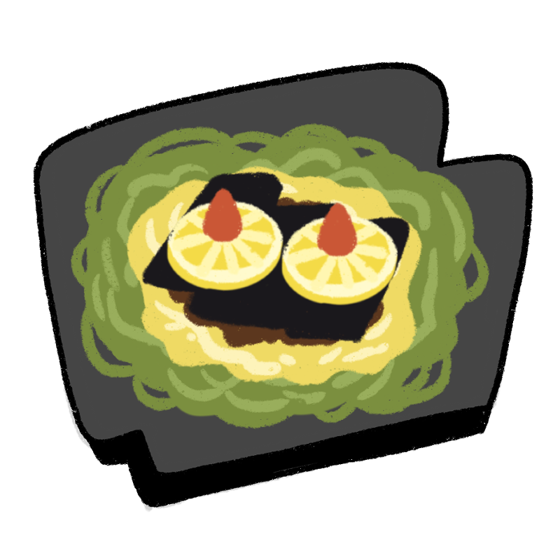 瓦そば 山口ご当地グルメ 上はモチモチ、下はカリカリいらすと手書きイラストゆるいイラストゆるい絵が好きゆるイラストシリーズゆるかわイラストほっこりイラストゆるいらすとぐらむイラスト好きな人と繋がりたいillustgramsimpledrawings插圖。