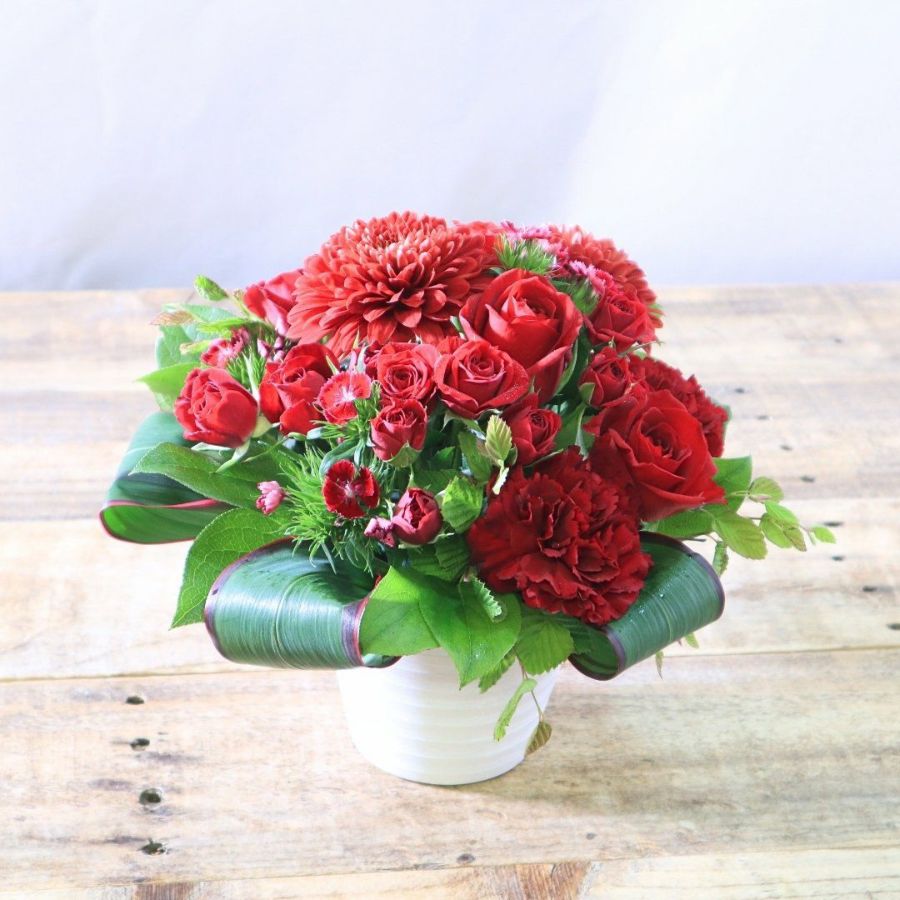 60歳 還暦祝いの花誕生日プレゼントに母・女性におすすめアレンジメント「スカーレット」おしゃれなMサイズ お花の通販フラワーギフトの全国発送花ギフト花以想 はないも。