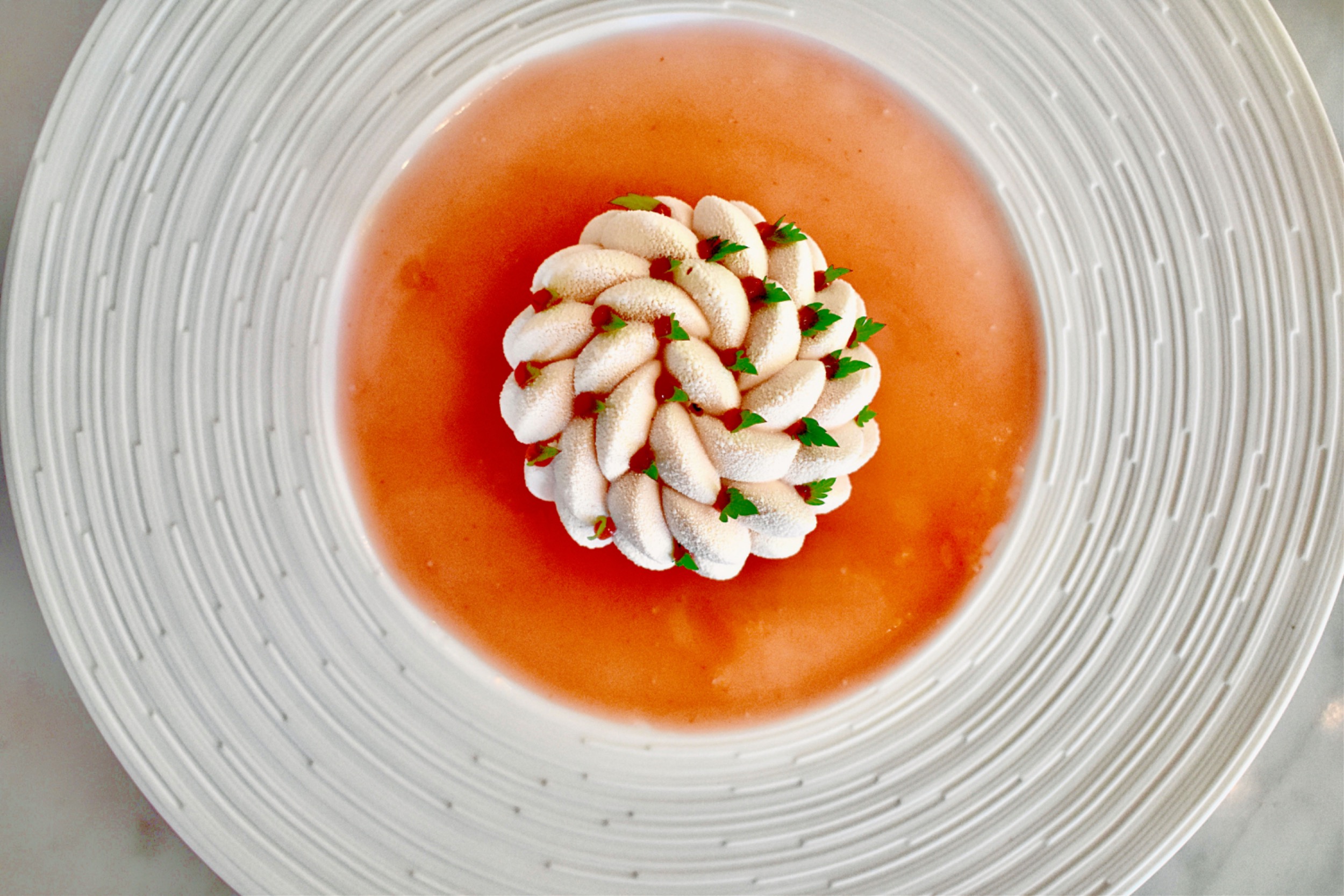 薬味を合わせた淡路の鱧のタルタル、フルーツトマトのベニエ, 丁寧に縦に薄く骨切りをした後に更に横にタルタルにするという苦行を乗り越えた末の料理です。,薬味と合わせたら熱々のフルーツトマトのベニエの上に乗せます。,カリッとグジュっと熱々のフルーツトマトのベニエからフレッシュトマトソースが溢れて鱧のタルタルと絡んで食べることができます。,。