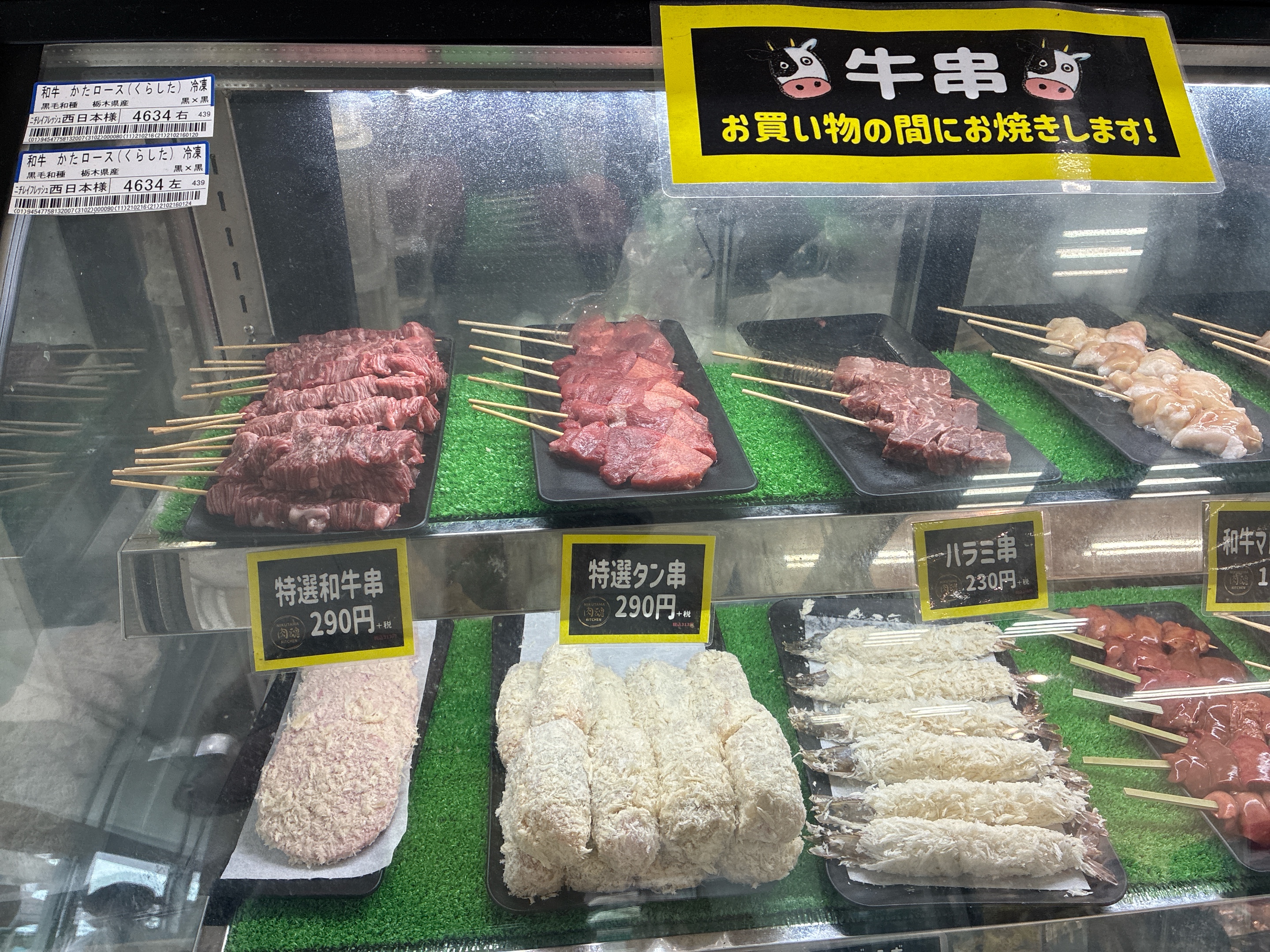 西明石 業務スーパー入り口にある『肉魂』のハラミ串や牛タン串・焼豚が美味しすぎて毎回買ってしまう。
