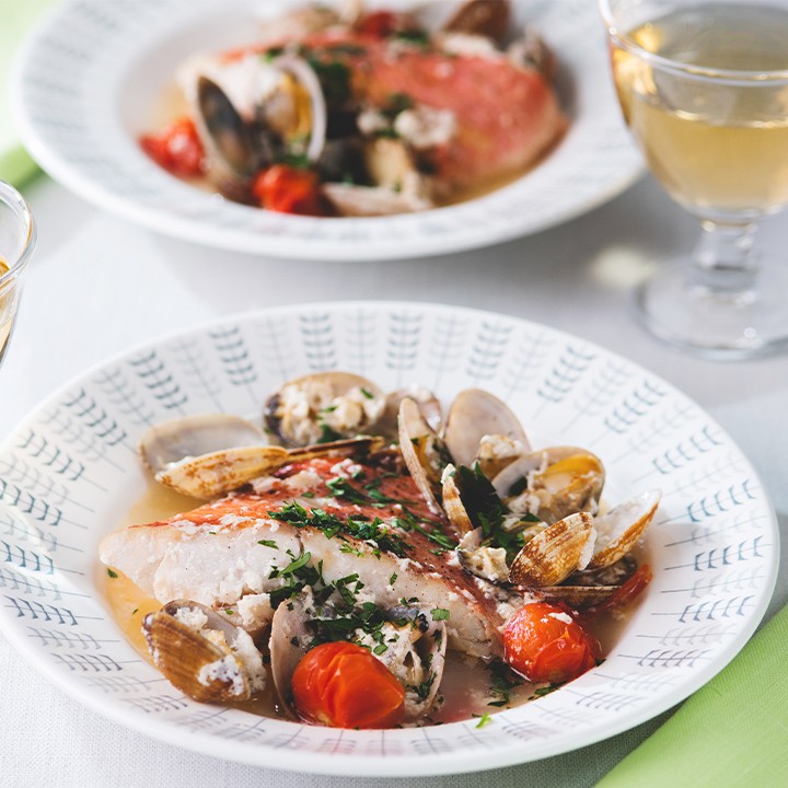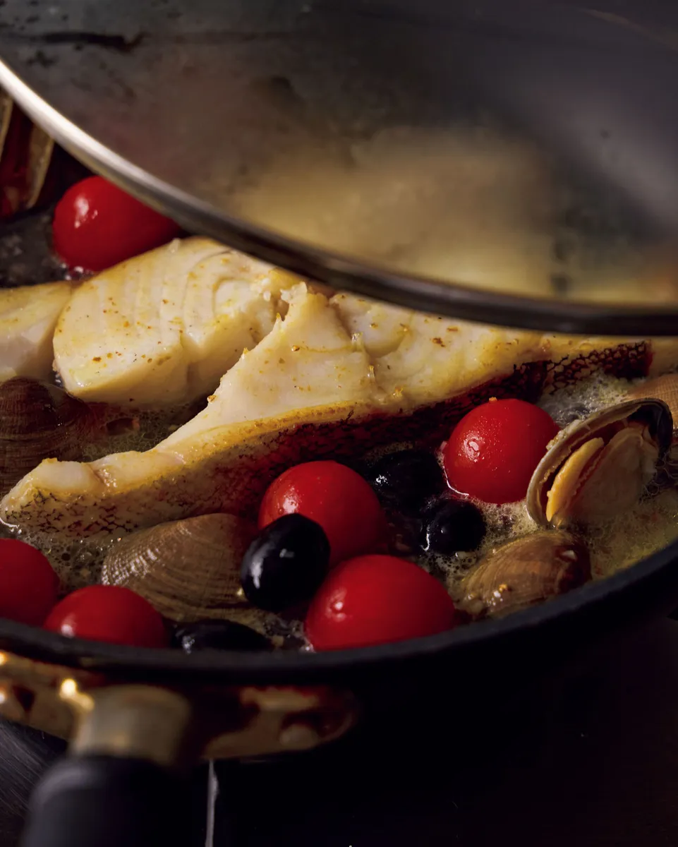 切り身魚のアクアパッツァ〜素材の旨味が凝縮したソースは最後の一滴まで味わい尽くしたい。