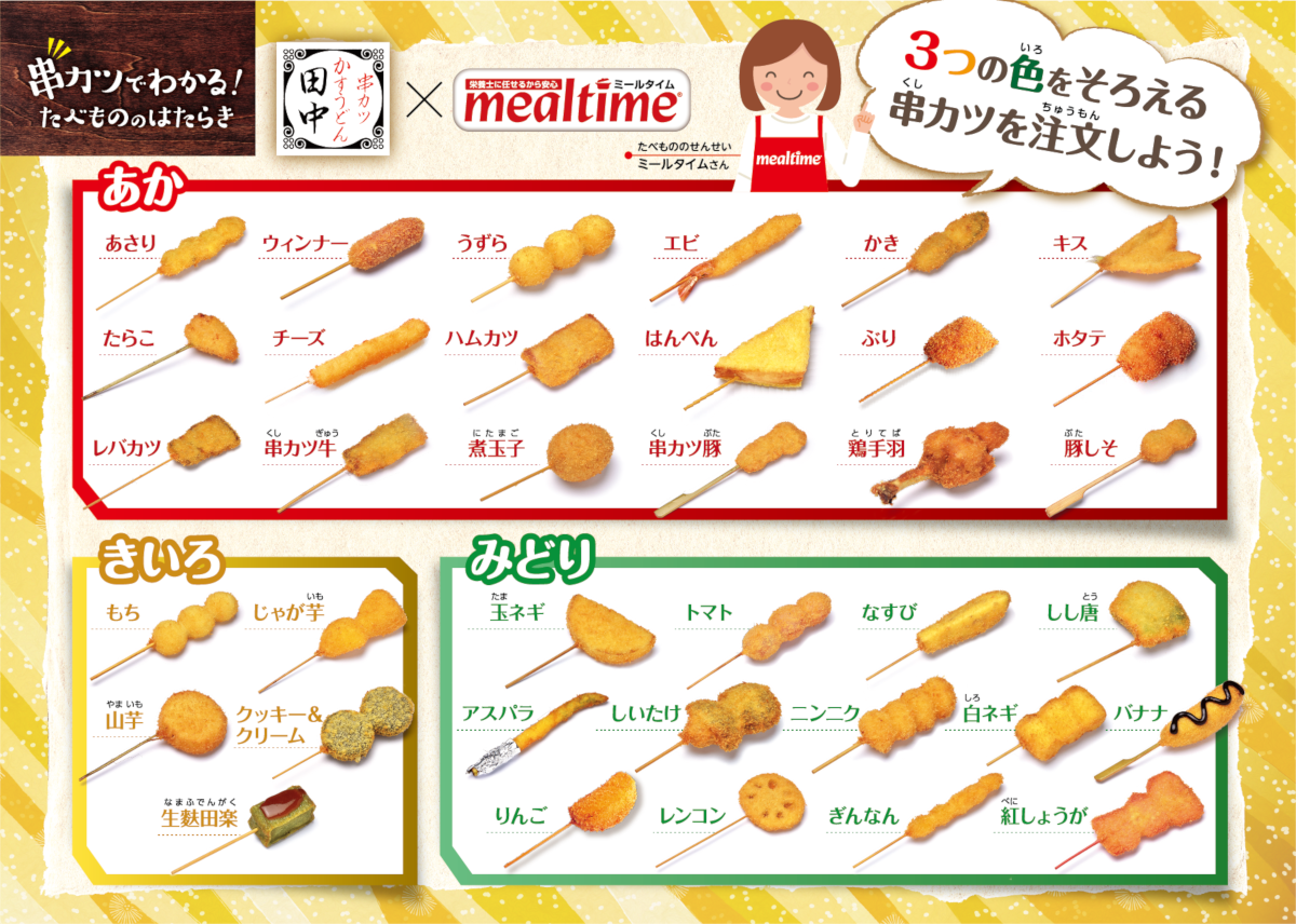 管理栄養士考案の食育ツール「串カツでわかるたべもののはたらき」 を全店の全テーブルに配置します。株式会社串カツ田中ホールディングス。