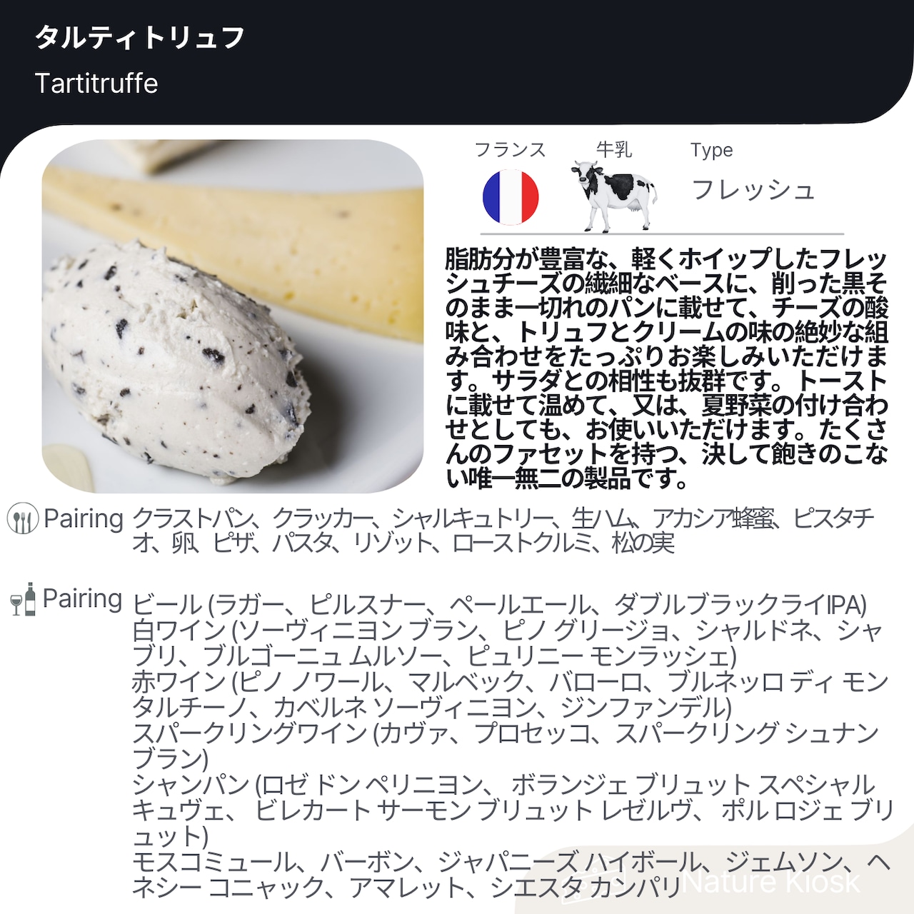 メゾン ドゥ ラ トリュフのレシピ タルティトリュフ 150g 黒トリュフ入り クリーム フレッシュ チーズ スプレッドTartitruffeMAISON de la TRUFFE Fresh Cream Cheese Spread 150gNature Kioskネイチャーキオスク世界各国のチーズ・生ハム・グルメ食品。