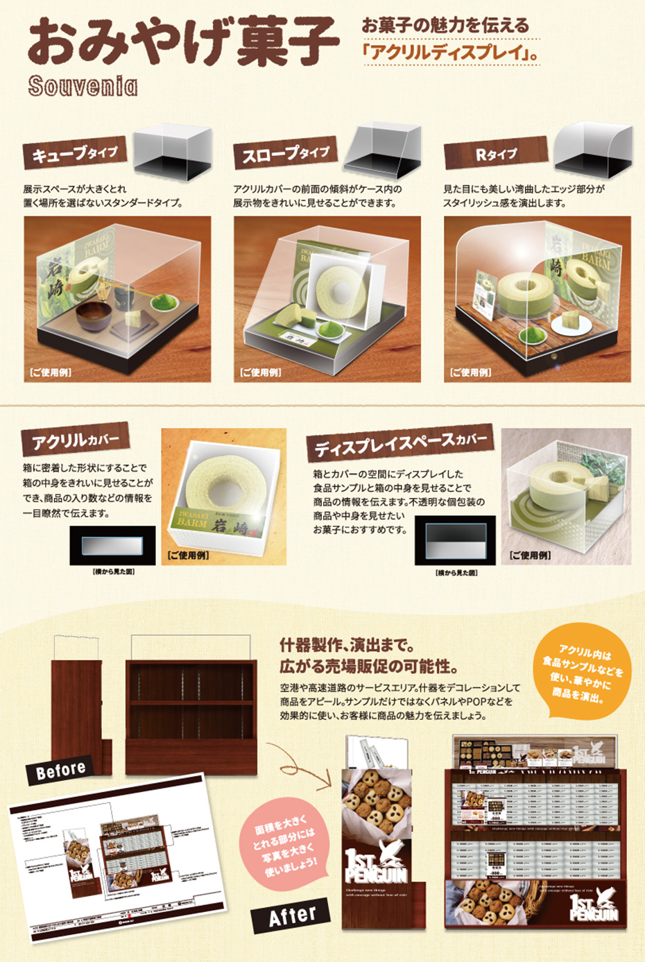 おみやげ菓子のアクリルディスプレイと什器 – イワサキ・ビーアイ 株式会社岩崎。