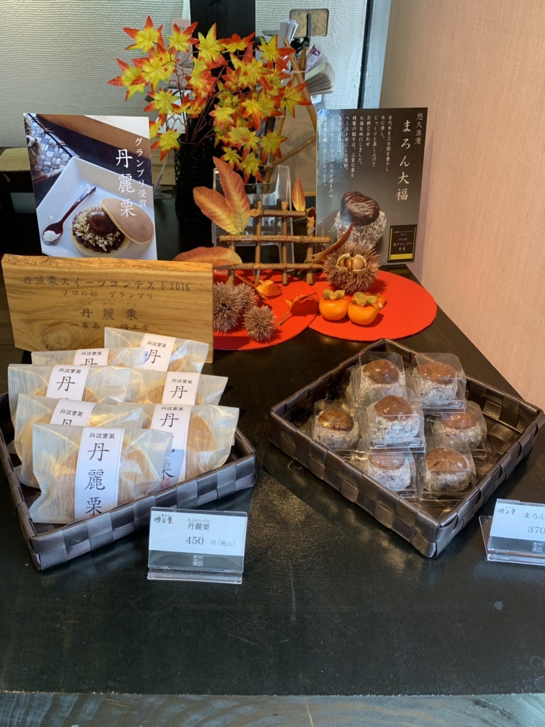 店舗入り口横のディスプレイに 明正堂の秋の味覚兵庫県丹波市 和菓子屋 明正堂のブログ。
