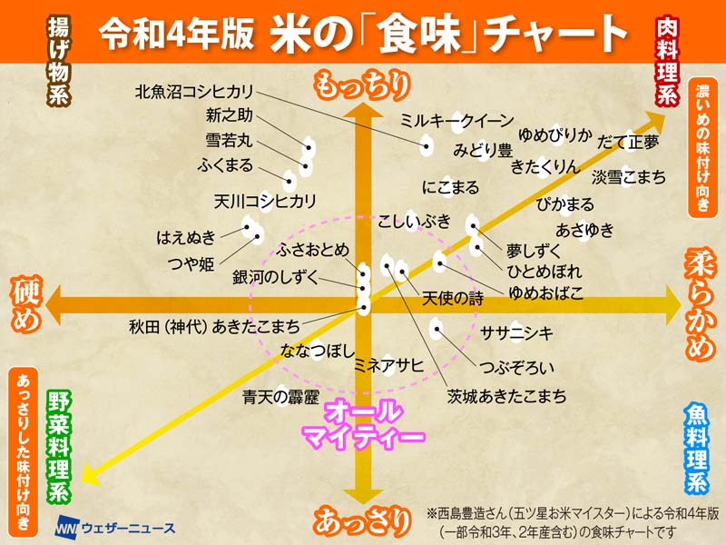 硬め派?柔らかめ派? 好みの品種を見つけられる「お米チャート」 - ウェザーニュース。
