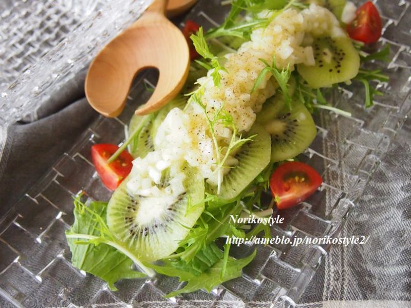 白だしで手作りドレッシング♪玉ねぎと水菜の和風サラダ。