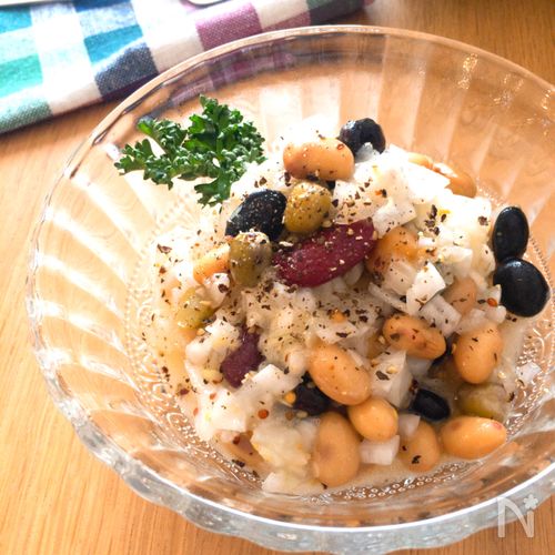 さっぱり白だしがポイント♡新玉ねぎとミックスビーンズのマリネ。