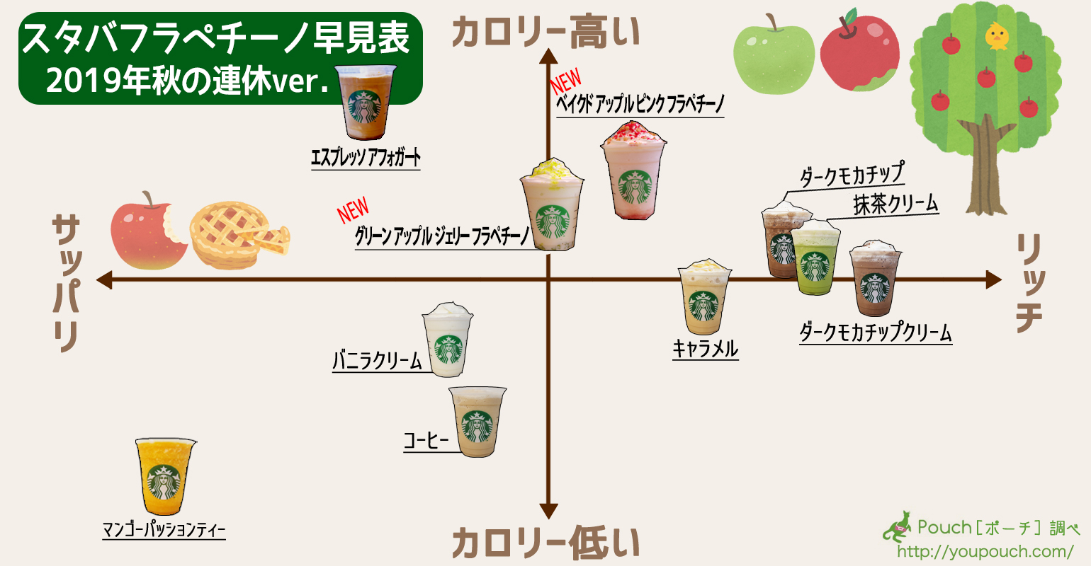 スタバの「フラペチーノ早見表」を作ったよ☆ カロリーとリッチ感がひとめでわかります2019年秋連休verPouch ポーチ。