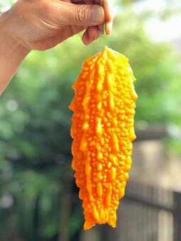 夏終わりに収穫した完熟のオレンジ色のゴーヤの写真・画像素材-Snapmart スナップマート。