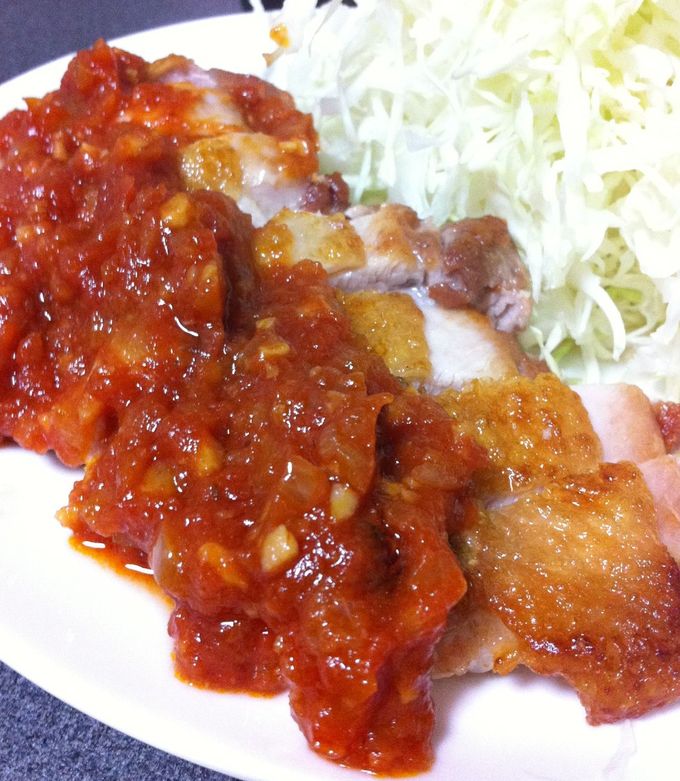 ガスト『若鶏のグリル ガーリックソース』ミックスグリルのトマトソースチキンが好きすぎてお家で作ってみた! ➀コールドスタートで皮目を強火2分➁蓋をして中火で3分 ➂裏返して蓋をせず中弱火で5分 計10分でカリッとしっとり。 その間にソースもレンジできる。