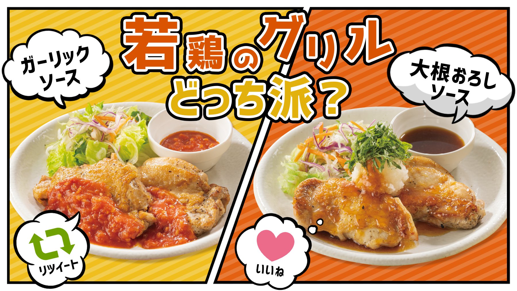 ガスト 公式on X: "\若鶏のグリル好き集まれ~!!と、集まっていただいたのですが、 ソースが2種類ありまして 🥩皆さんはどちらのソースが好きですか?🤔 ガーリックソース派→RT🧄 大葉おろしソース派→いいね🥬 どっちも好き!迷う!という方は 最近食べた方。