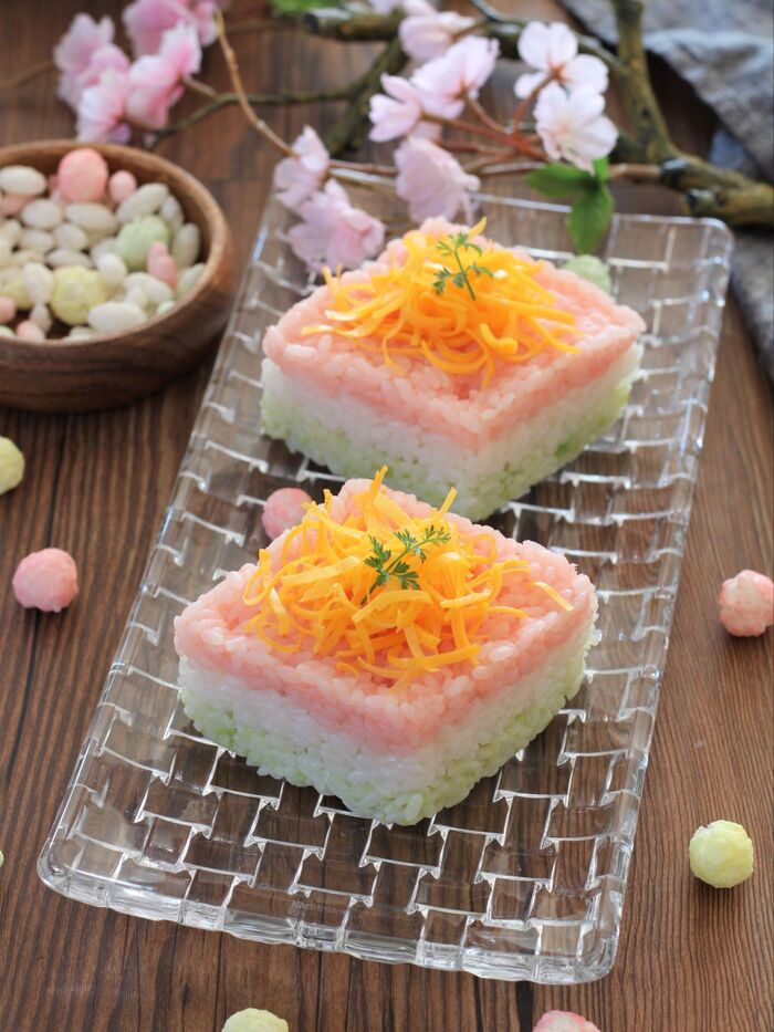 ひな祭りのひし餅風ちらし寿司。