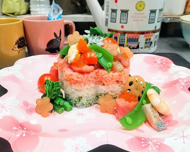 ひな祭りの菱餅風ちらし寿司。