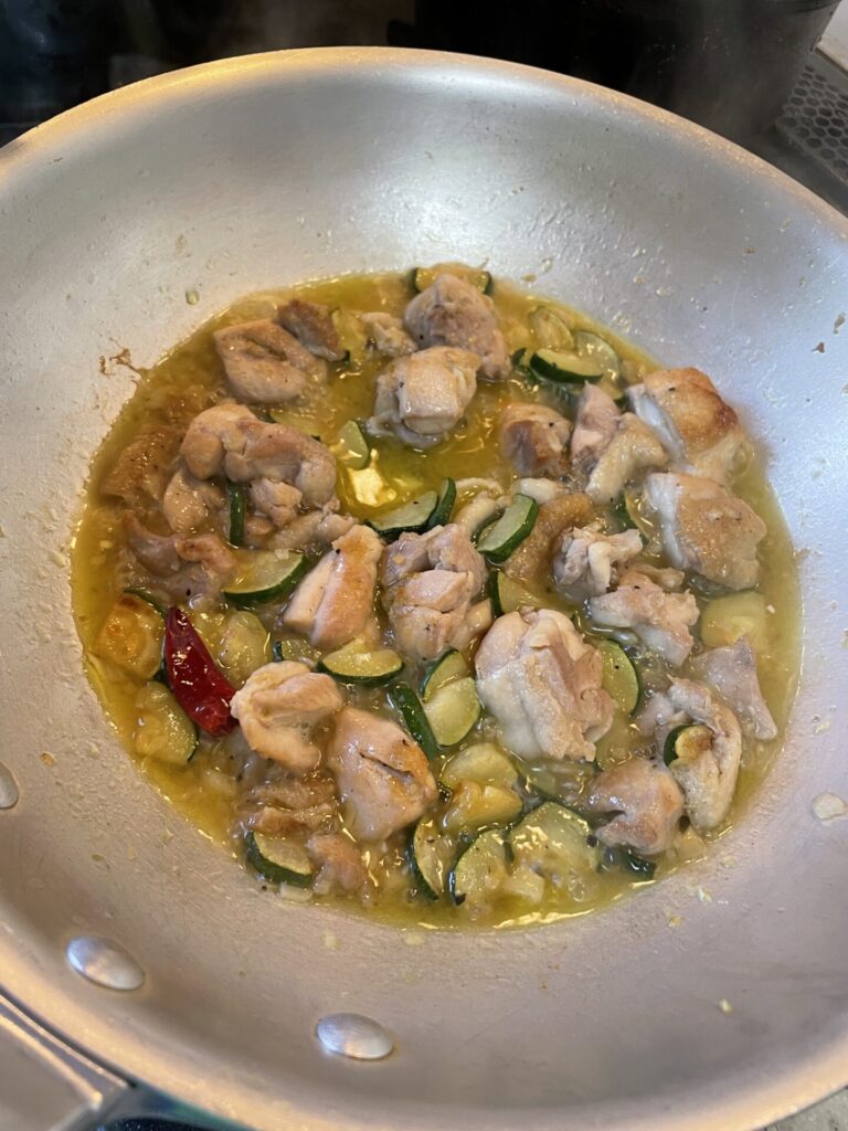 鶏肉とズッキーニのにんにくパスタ。