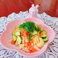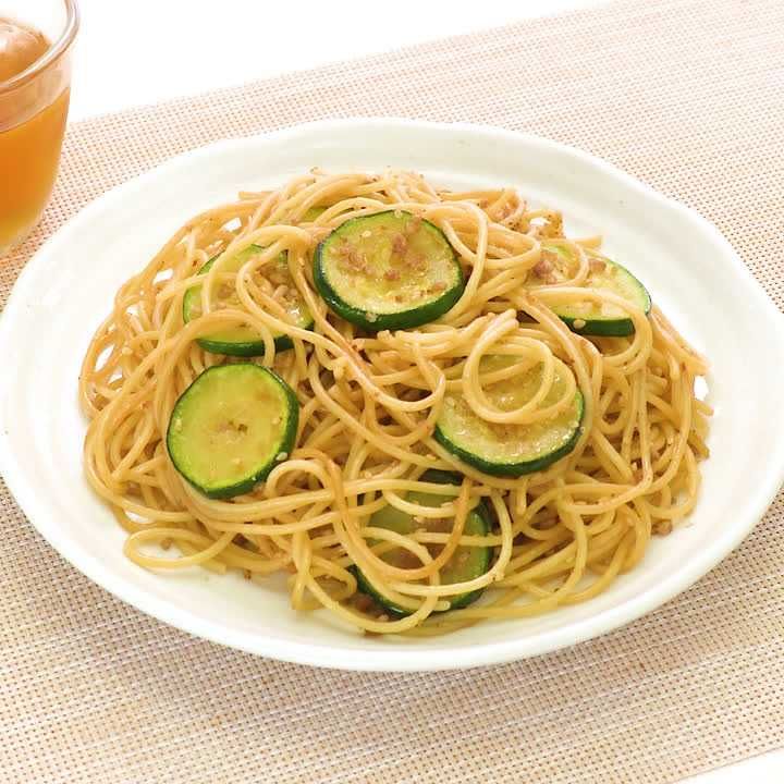 ズッキーニと揚げ鶏の冷製おかかレモンパスタ。