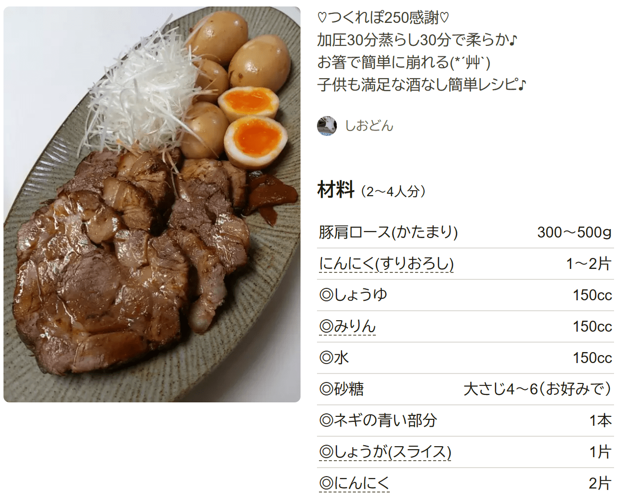 焼き豚 チャーシュー圧力鍋レシピ 人気1位・殿堂入り クックパッドつくれぽ1000越え夕食のおかず.com。