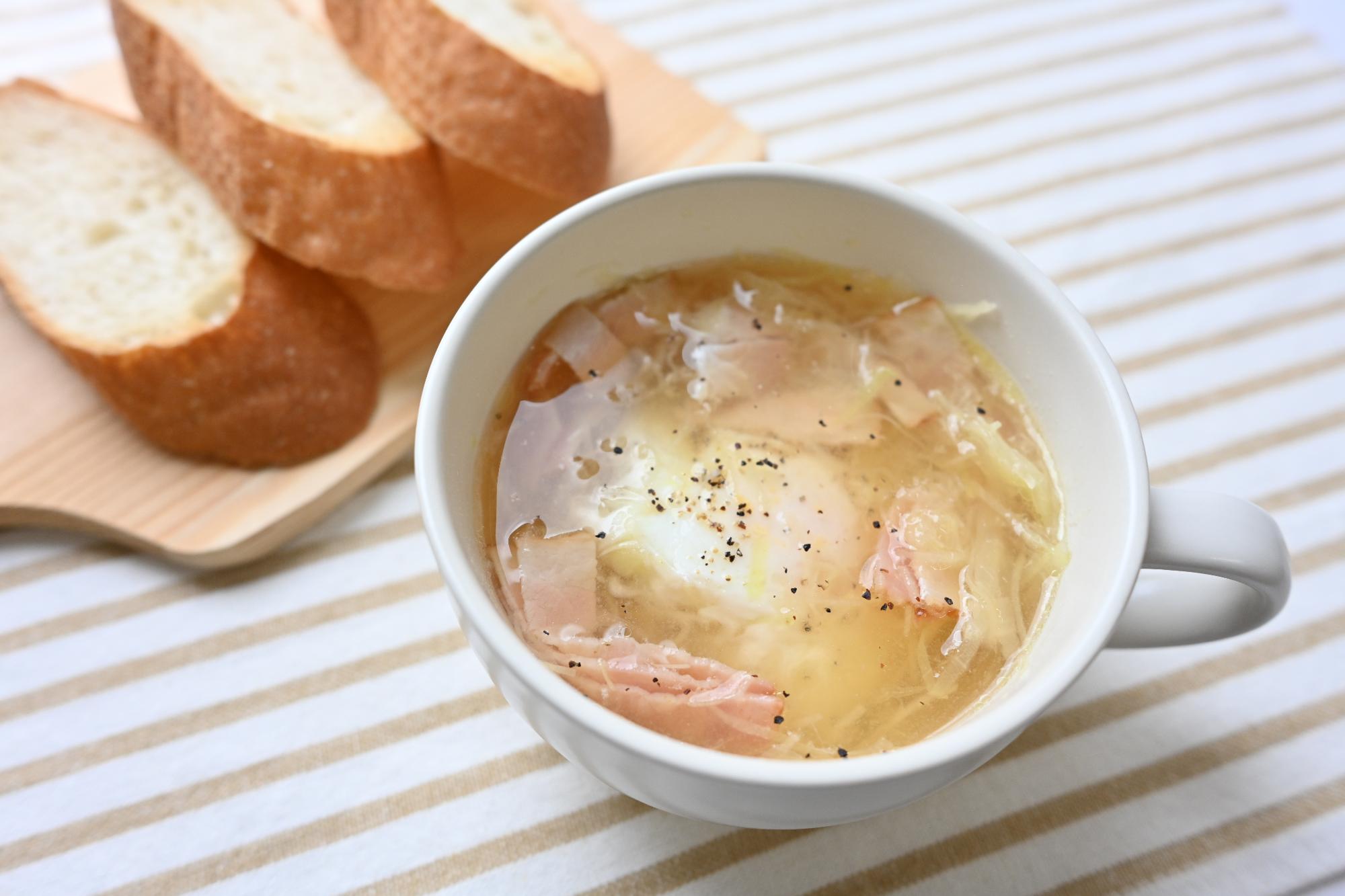 マグカップで簡単!巣ごもり卵のコンソメスープ 宇佐市。