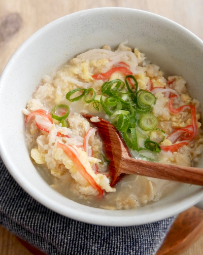 マグカップで♪ふんわり卵のオートミール雑炊。