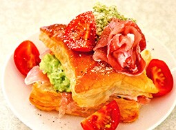 皿に盛られた、正方形にカットされた、いちごのショートケーキの無料イラストイラストセンタ。