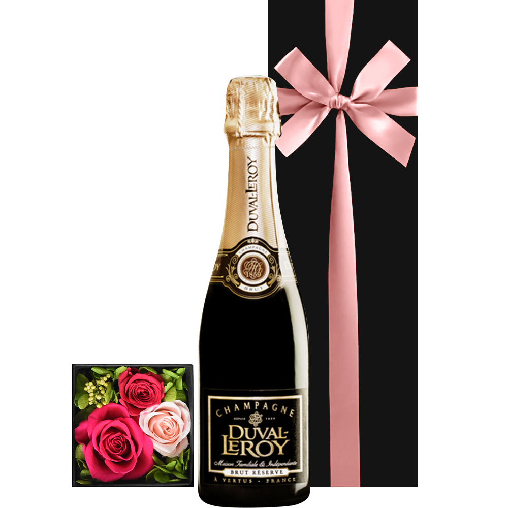ギフト箱・リボン付き お返し シャンパン 花 ギフト フランス 「デュヴァル・ルロワ」 辛口 375ml ハーフボトル 泡 ワインプリザーブドフラワー ボックス ピンク バラ おしゃれ 誕生日 女性 お母さん 妻 彼女 プレゼント 送料無料 -ワイン&ギフト オリジン・グルメ。