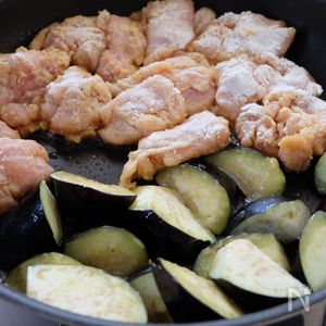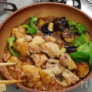 揚げ焼きで簡単 鶏ももとナスの甘酢だれ。