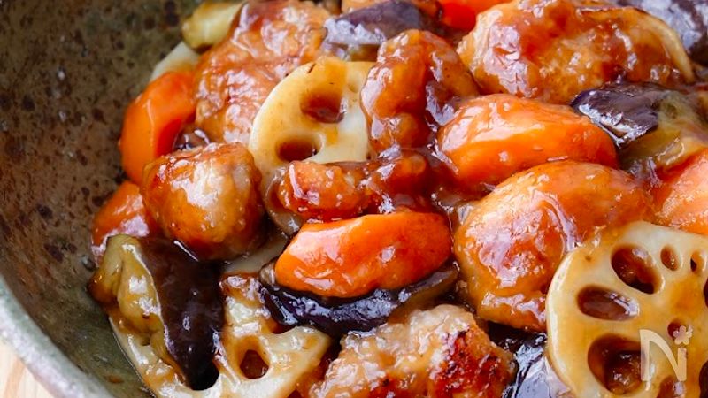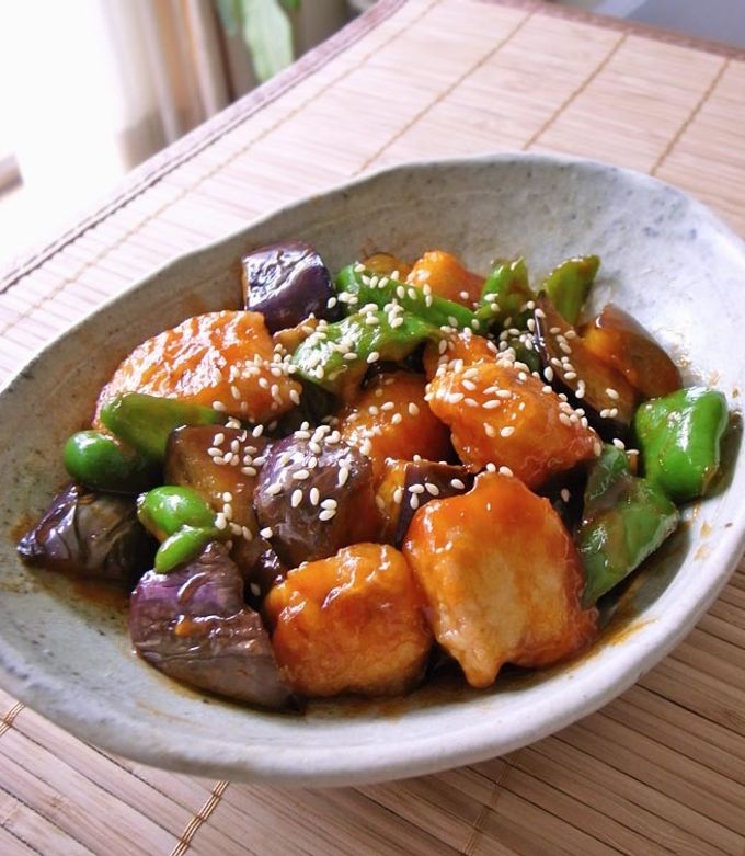 お箸がすすむ♪ 鶏肉となすの甘酢がらめ。
