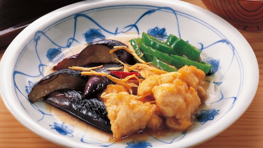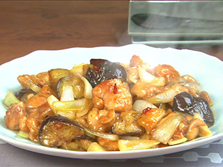 ナスと鶏もも肉の激辛甘酢あんかけ。