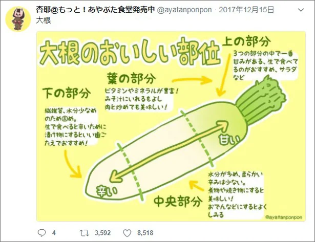クックパッドニュース:甘いのはどこ?大根の「部位別」特徴を野菜博士・緒方湊くんが解説毎日新聞。