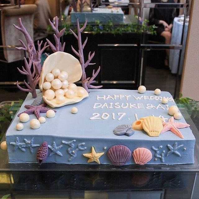 海をイメージした世界に1つだけのウェディングケーキ✨」 * ご結婚式のウェディングケーキは、個性あふれるおふたりらしい世界に1つだけのデザインにしたいですよね💕* 今回は『海』を表現して作られたウェディングケーキのご紹介です💡 * 💎水色で海を可愛く表現 💎貝殻。