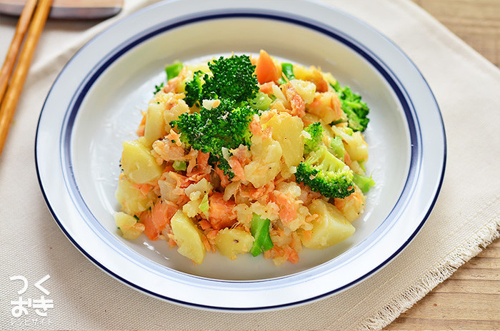レンジで手軽に!さけ入り具だくさんおかずポテトサラダ。