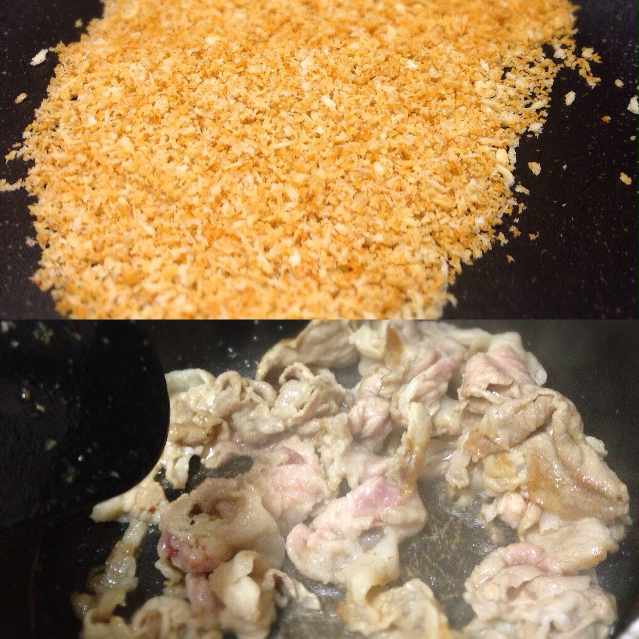 リュウジ@料理のおじさんバズレシピ on X: "パン粉一掴みを大匙一杯の油と中火で柴犬色になるまで炒めます塩胡椒した豚肉を油で炒めポークソテーにし、軽く表面を拭きマヨを両面に塗ります 皿にパン粉を敷き、肉を乗せ残りのパン粉をかけたら揚げないトンカツです油で。