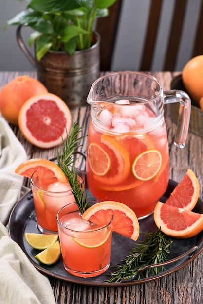 フレッシュグレープフルーツカクテル。グレープフルーツ、ライム、ローズマリーの小枝、角氷を使った新鮮な夏のカクテル。Premium写真。