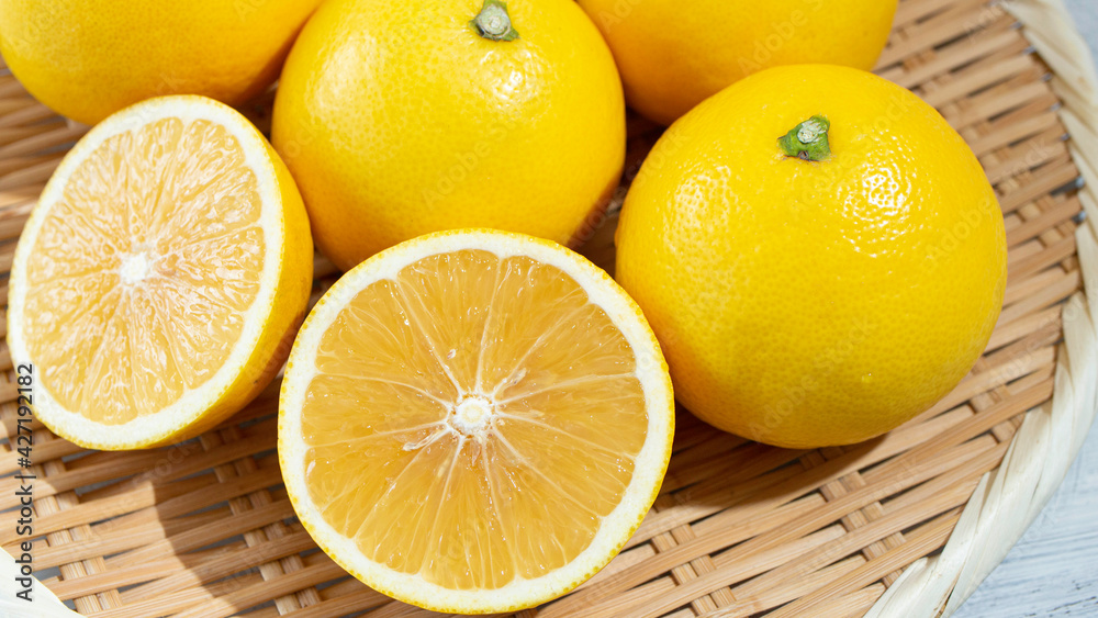 宮崎県産の日向夏 苦みのないグレープフルーツのようなさわやかな甘みをもつ品種日本産 、4月撮影 の Stock フォトAdobe Stock。