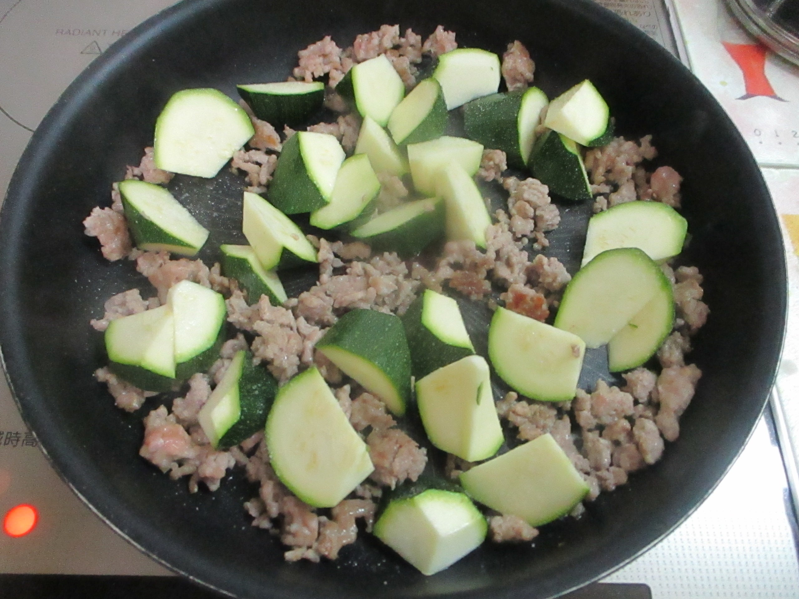 ズッキーニとなすとひき肉のガーリックペッパー炒めよっちの日曜料理日記。