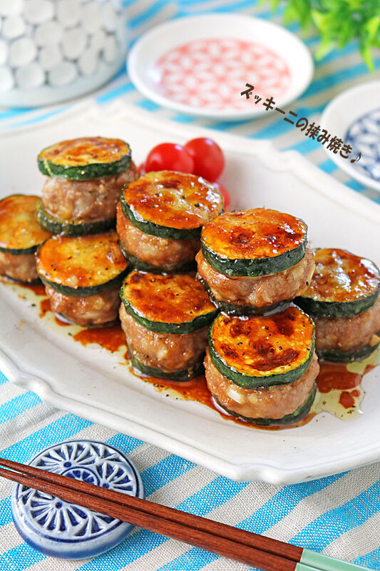 みんな大好き甘辛タレ! ズッキーニのひき肉はさみ焼き。