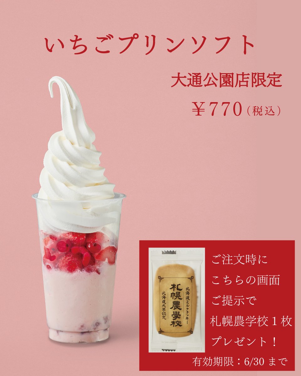 きのとや on X: " 大通公園店限定 「いちごプリンソフト」 6 30までの期間いちごプリンソフトをご注文時に、この画面ご提示で札幌農学校1枚をプレゼント!北海道完熟いちごを使用したいちごプリンに、3種のベリーとソフトクリームを重ねました。 クッキーのサクサク感。