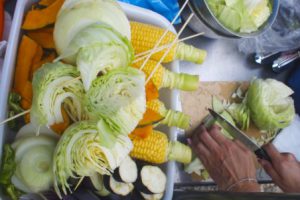 シーザーサラダに次いで人気の、 “オリエンタルチキンサラダ” レタス、ニンジン、大根、白菜、キュウリ、セロリ等たっぷりの野菜に蒸した鶏胸肉とパクチーをのせました。スイートチリソースをベースにナンプラーやピーナッツオイルなどいくつかの材料を使った甘辛の。