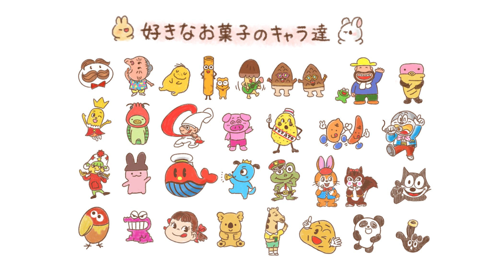 くぅもんせ on X: "頑張って描きました✨ それぞれ何のお菓子か分かるかな ?お菓子駄菓子キャラクターhttps:t.co OaxllMuKqS"X。