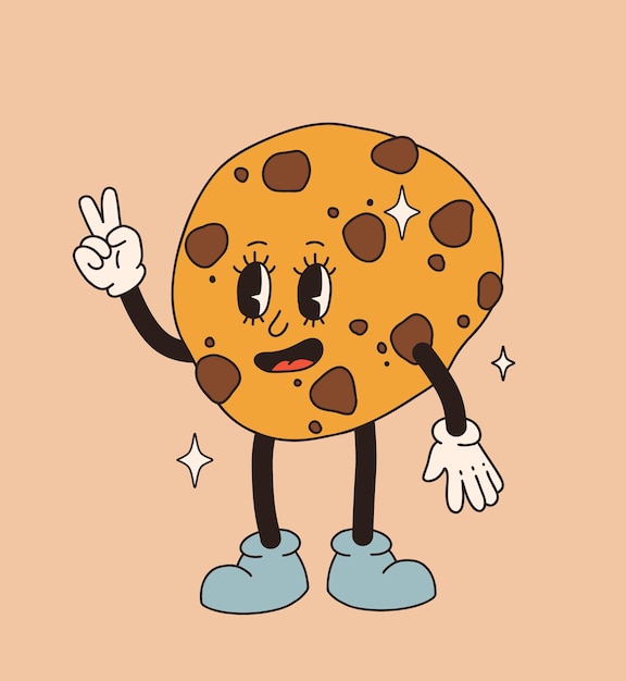 レトロなデザートキャラクターかわいい漫画のマスコットお菓子笑顔ウォーキング甘い食べ物変な顔ヴィンテージチョコレートチップクッキーベーカリーキャラクターベクトルセットPremiumベクトル素材。