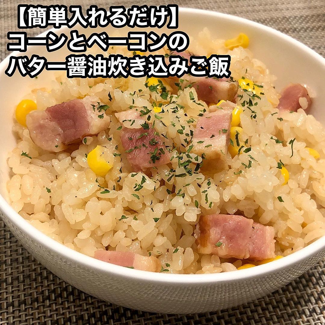 丸ごとベーコン炊き込みご飯』 ① 炊飯器に米 1 合 、黒コショウ 少々 、顆粒コンソメ 小さじ 1.5 、コーン 80g を入れる ②水を1合の目盛りまで入れる ③ ブロックベーコン 200g を丸ごとのせ炊飯する ④ 炊けたらバター 15g を入れ、ベーコンを崩しながら。