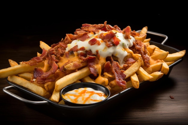 チーズソースと脆いニンニクのフライドポテトPremium AI生成画像。