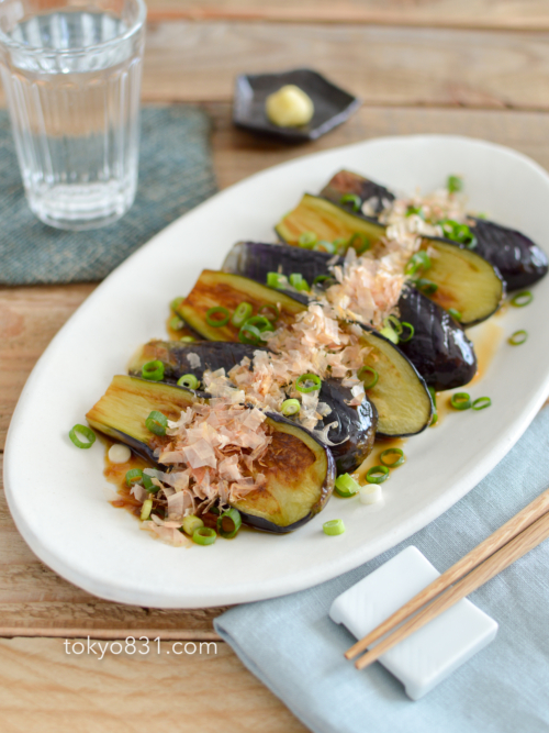 ナスと醤油の美味しいおつまみ「ナスのガリバタ醤油ステーキ」おつまみレシピたのしいお酒.jp。