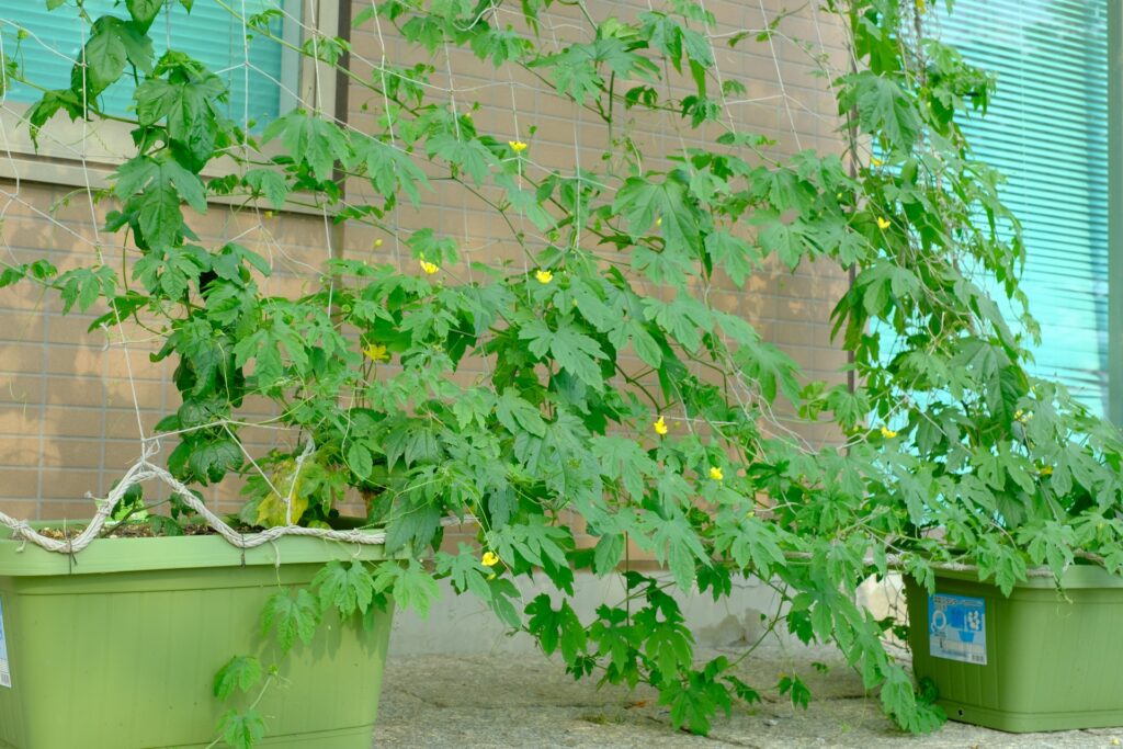 ゴーヤのグリーンカーテン 育て方のコツ、プランターの選び方、摘心など。