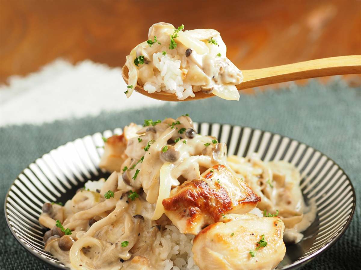 メシ通!「鶏むね肉のチキンフリカッセ風丼」 - 魚料理と簡単レシピ。