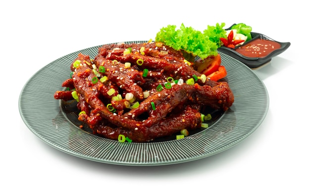 スパイシーチキンフィートスウィートホットおいしい料理ダクバル韓国料理スタイルは唐辛子、ニンニク、コチュジャンソースのサイドビューを提供Premium写真。