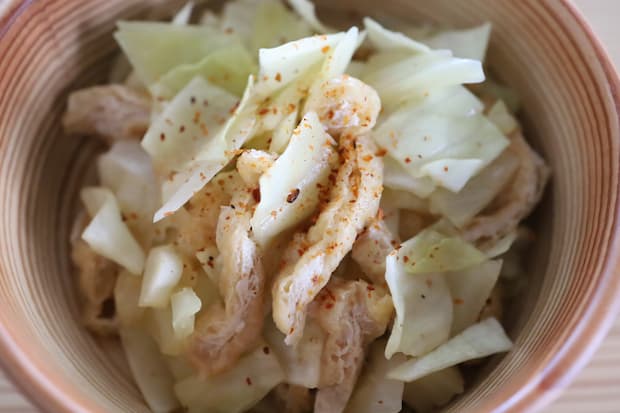 電子レンジを使ってお手軽に!キャベツと油揚げのレンチン煮時短簡単節約おかずレシピ真由美さんの1週間2500円節約レシピ。
