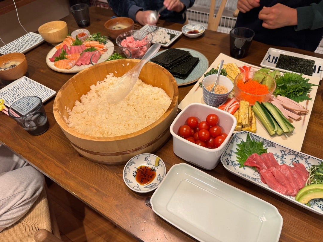 家にお友達が来てくれた時のご飯たち👩🏻🍳, 大人が多い時は手巻き寿司メインが我が家の定番🤤🍣,華やかになるし材料揃えるだけだし味付けの好みも関係ないから✌🏻, +子供用に🍝🍟🍗とか👦🏻👧🏻,子供のお友達が遊びに来てくれる時は、年中さんにもなると小さなシェフたちがいて頼もしいから皆で楽しんで作れるメニューを🍛🍕🍴,。