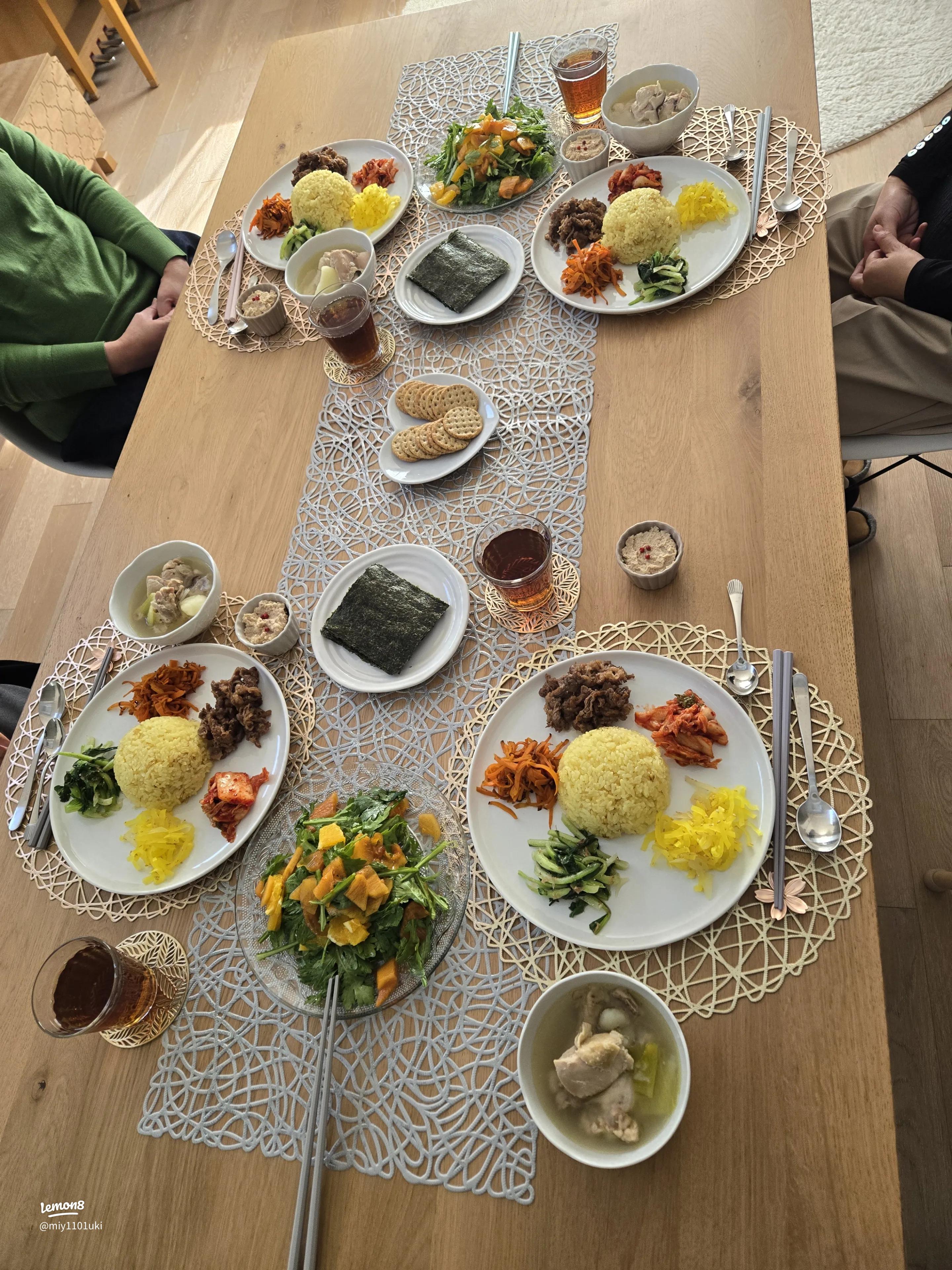 お友達とお泊まりご飯♡ . 最近嬉しいことにお友達が泊まりに来てくれることが多くて、リビングでダラダラしながら食べることが多いです🥰 .リビングはポカポカカーペットも テレビもあってダラダラ食べられて、 こういう食事も好き🫶 . 韓国好きのお友達だったので。