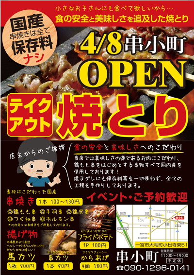 栃木県 ニューオープン告知チラシ 焼鳥屋飲食店のチラシデザイン作成・印刷なら飲食チラシ制作.com。